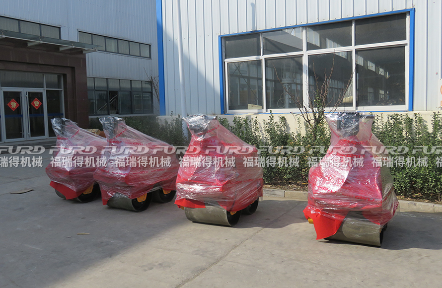 3月12日,福瑞得机械将广州客户一周前订购的4台手扶双轮压路机打包发出。
