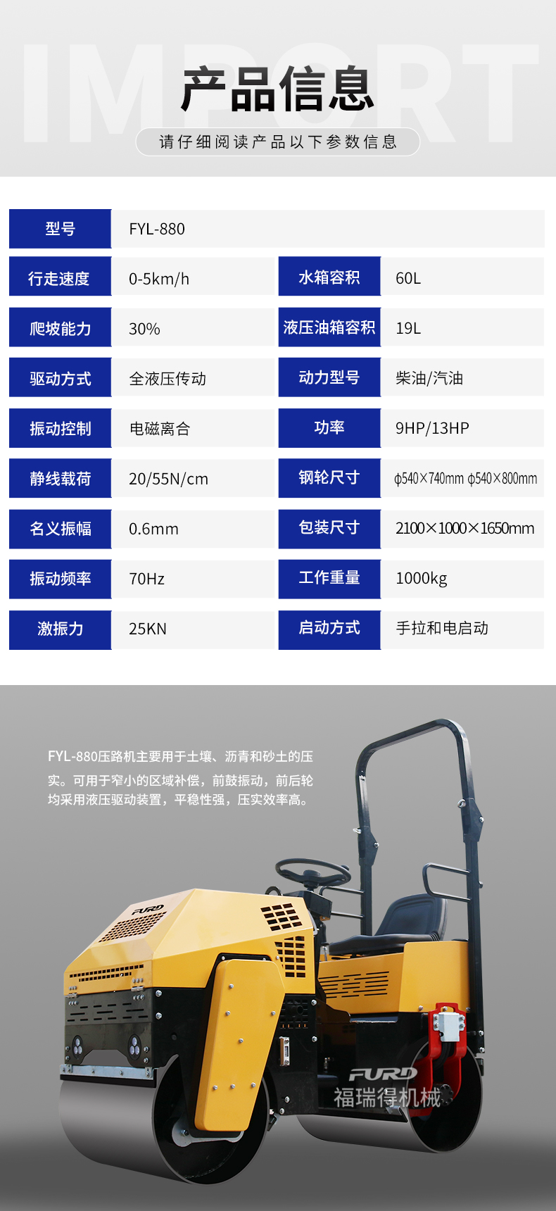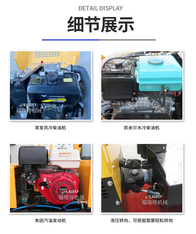 主要用于沟渠基础,道路,体育场地的压实整平,也可用于压实沥青表面的作业。