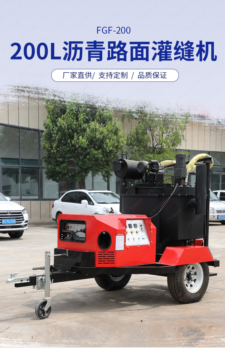 沥青灌缝机,使用原料为沥青灌缝胶,主要用于沥青路面不规则裂缝、混凝土路面、桥梁伸缩缝、上下水道、煤气管埋设机铺装路面的连结处防水处理,而专门设计、生产的沥青补灌缝专业机械。