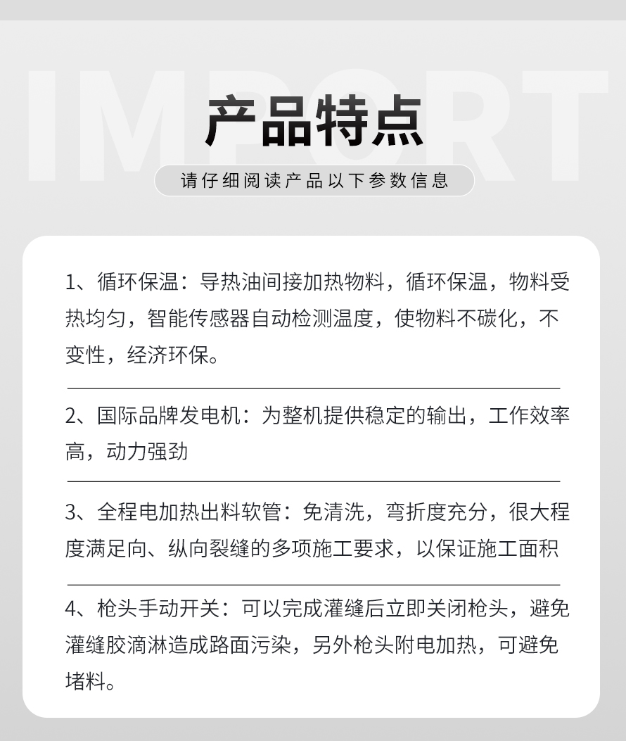 沥青灌缝机,使用原料为沥青灌缝胶,主要用于沥青路面不规则裂缝、混凝土路面、桥梁伸缩缝、上下水道、煤气管埋设机铺装路面的连结处防水处理,而专门设计、生产的沥青补灌缝专业机械。