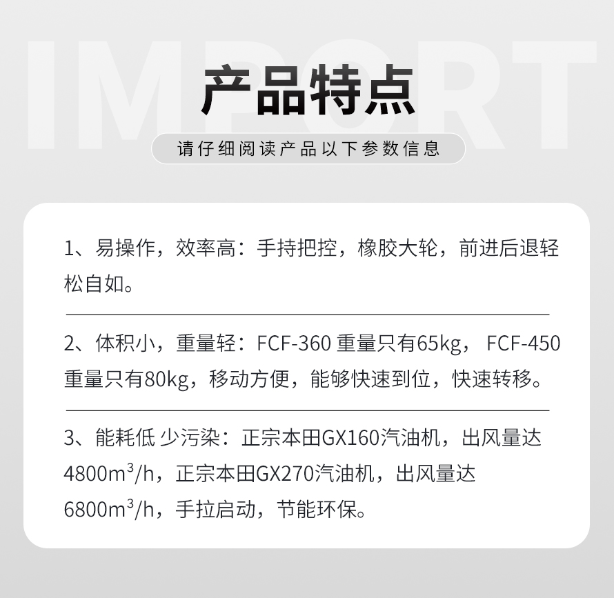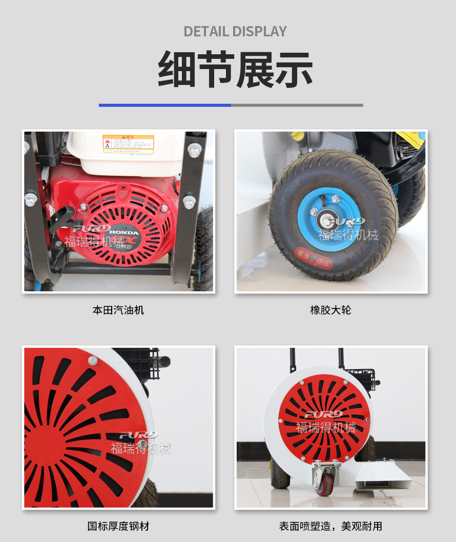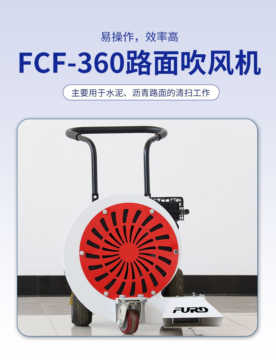 用于水泥、沥青路面的清扫、清洁。 1.本田汽油动力,性能稳定; 2.动力平衡极好的风叶,保证整体的稳定性; 3.超大风量,性能优越。