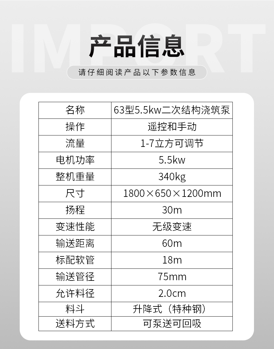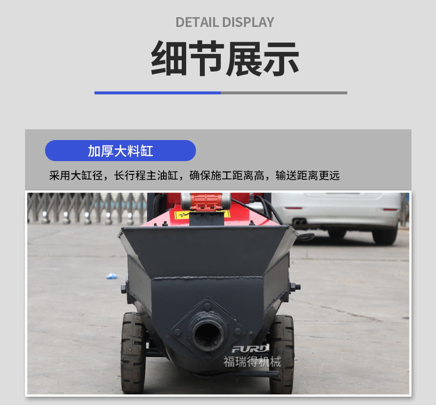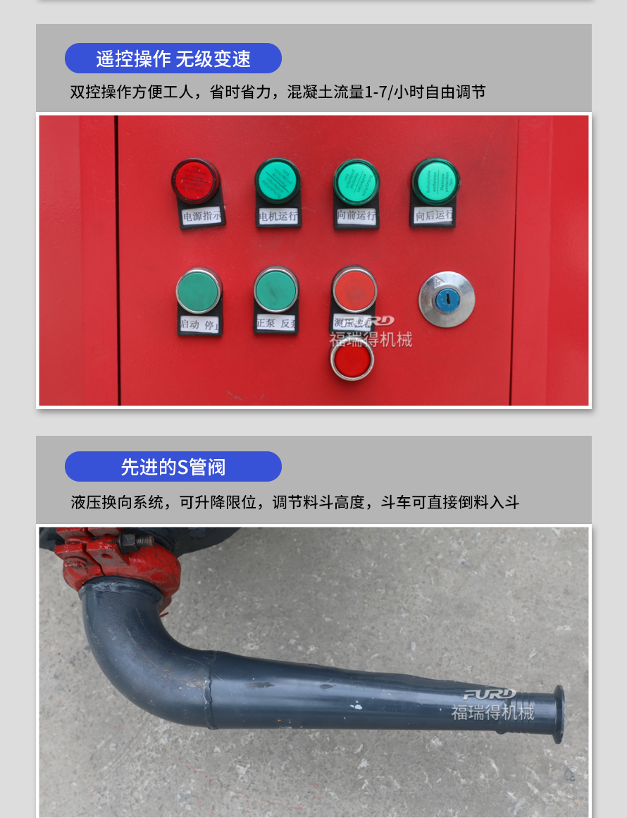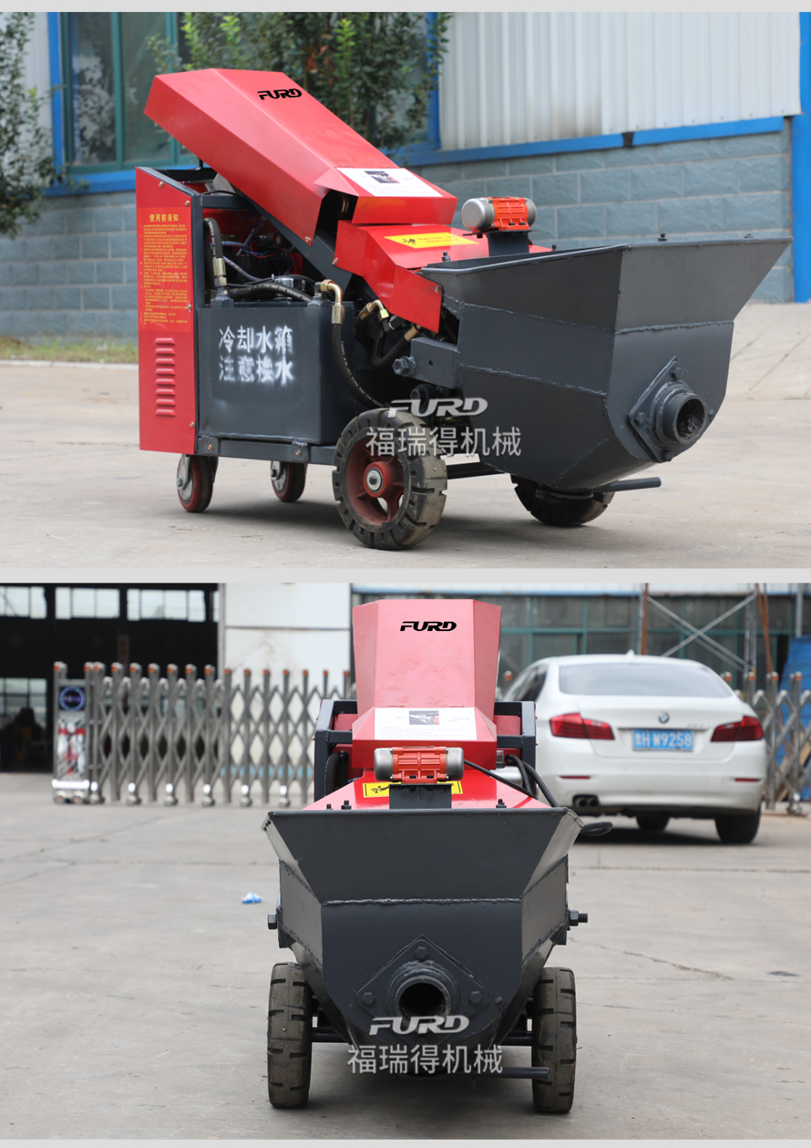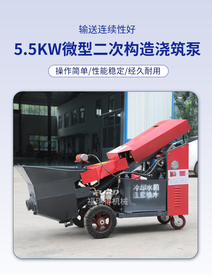 福瑞得二次结构浇筑泵适用于商品房、农村建房,打二次构造柱,圈梁等,是您浇筑的好设备。电机功率小,体积小,重量轻,料斗可升降,真正能提高您的施工效率,是人工浇筑的几十倍。