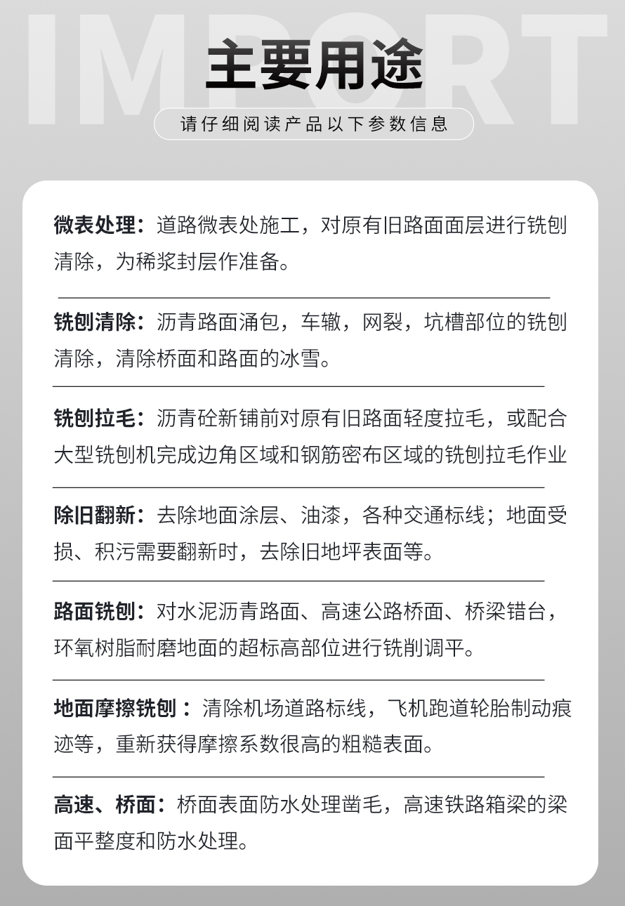 用于桥面铺设沥青或车间旧的混凝土地面重新摊铺混凝土之前,清除水泥浮浆以及铲平拉毛, 也用于清除建筑施工中的坚硬灰渣。