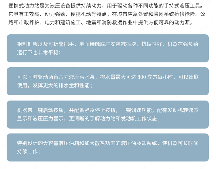 适用于路面抢修、道路施工、市政维护、保养、园林等工作场景 ;.设备安装便捷,搬运简便,适应性强,可轻松解决破碎、切削、分裂、打桩、压实等施工项目。