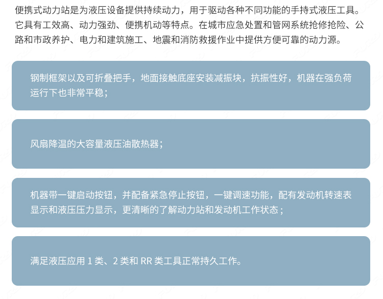 适用于路面抢修、道路施工、市政维护、保养、园林等工作场景 ;.设备安装便捷,搬运简便,适应性强,可轻松解决破碎、切削、分裂、打桩、压实等施工项目。